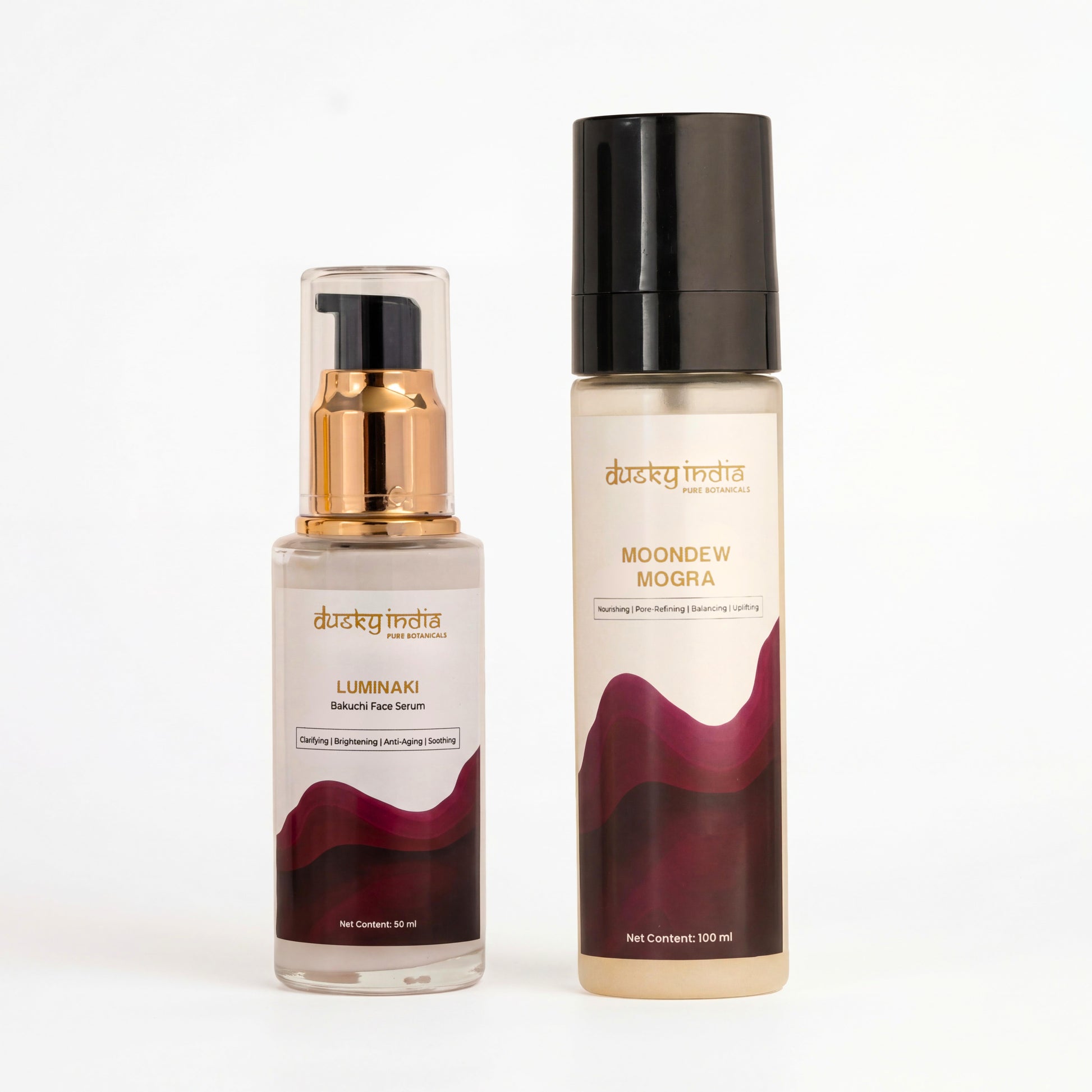 Luminaki Bakuchi Serum supports smoother texture, improved elasticity, and a more even-looking tone using plant-based bakuchiol. Moondēw Mogra delivers lasting hydration and calming floral nourishment, helping maintain a soft, supple finish.