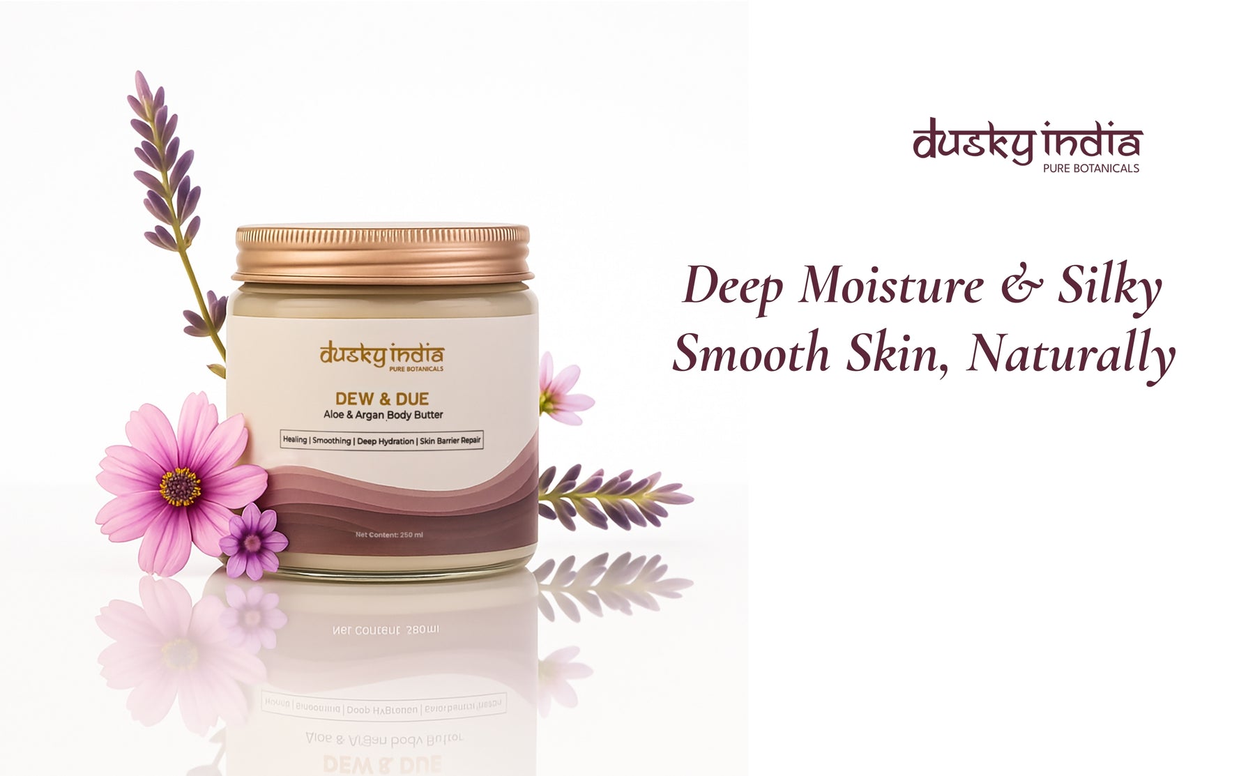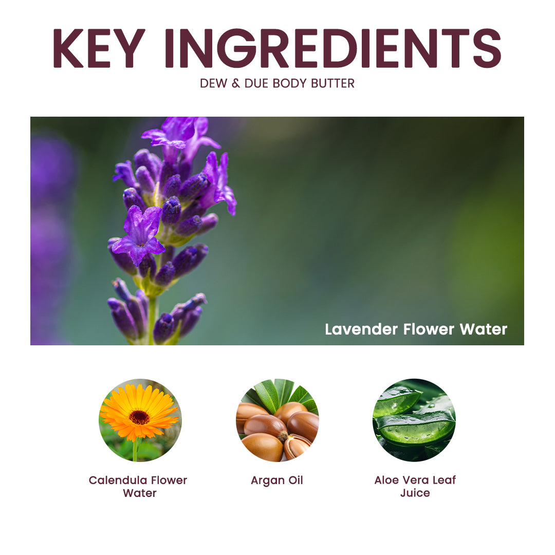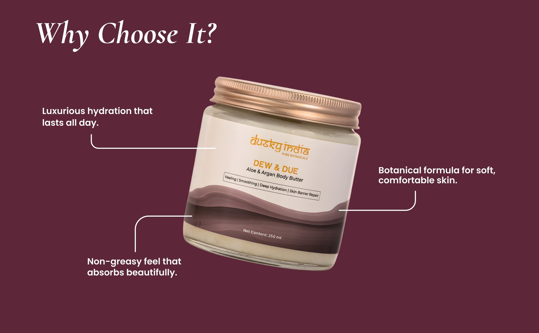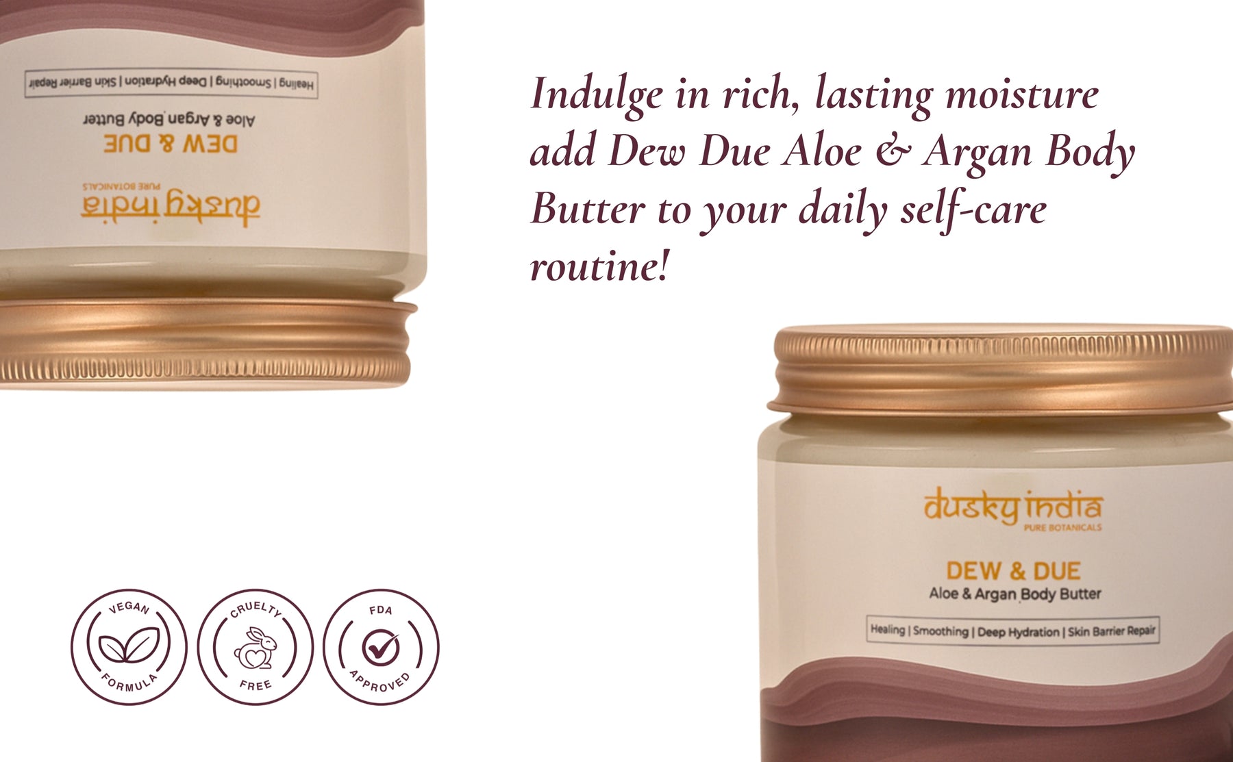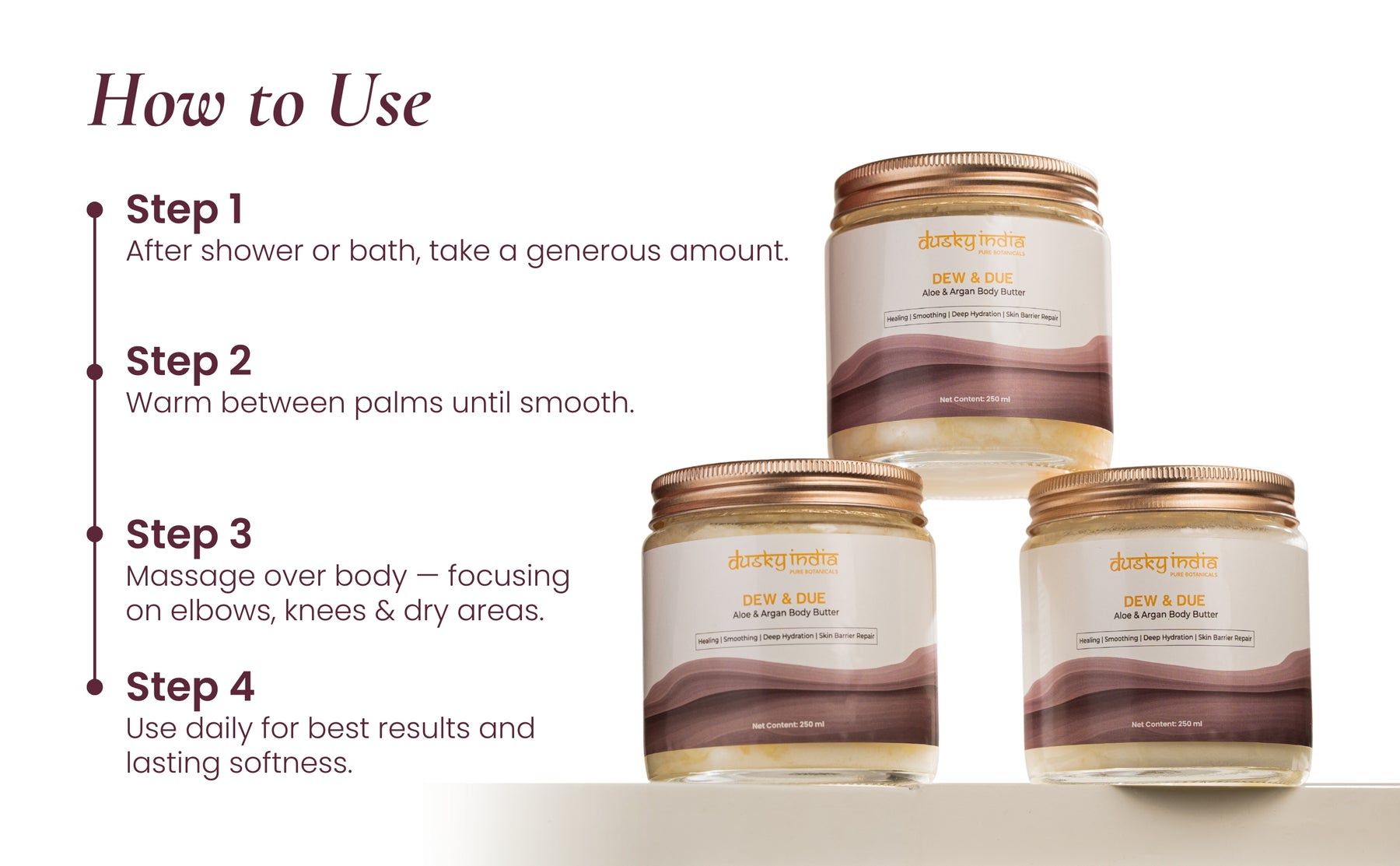 Use Dew & Due – Aloe & Argan Body Butter daily after showering on damp skin to deeply hydrate and nourish. It’s perfect whenever your skin feels dry, irritated, or in need of extra softness and repair.