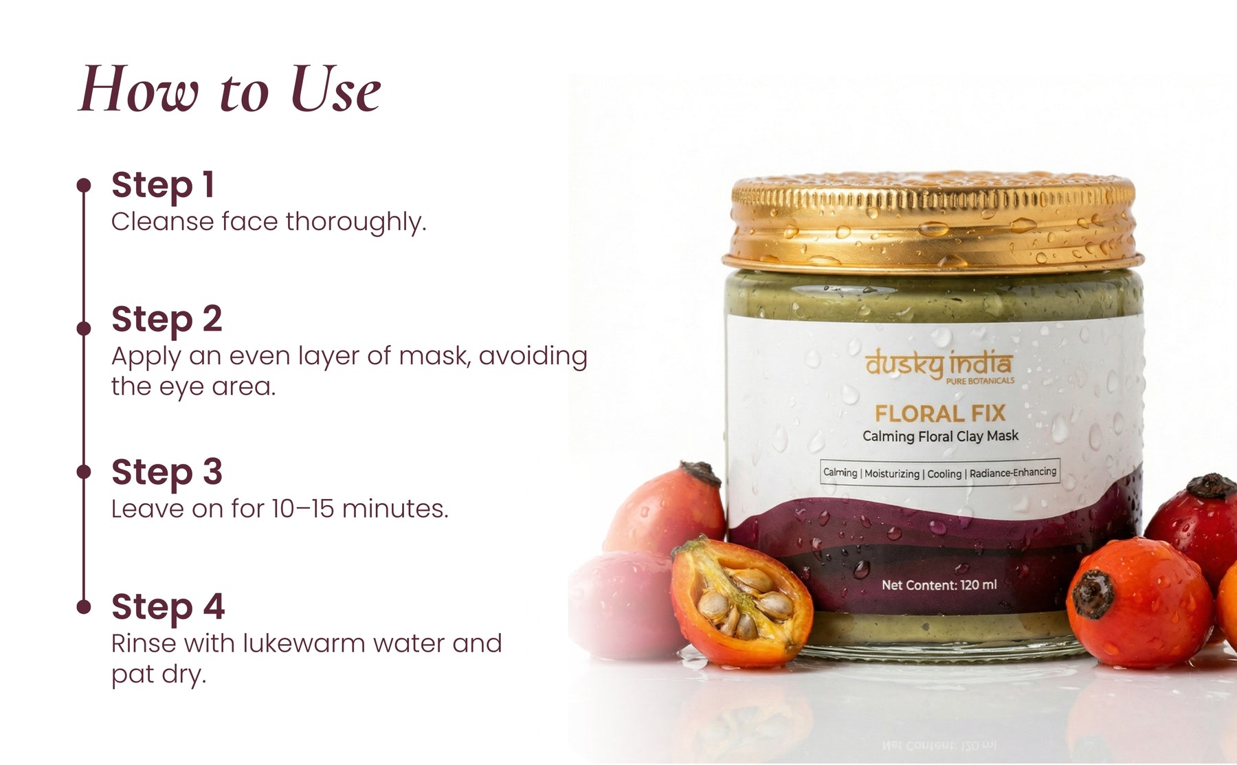 Use Floral Fix – Calming Floral Clay Mask 2–3 times a week on clean, dry skin to refresh and nourish your complexion. It’s perfect whenever your skin feels stressed, dull, or needs a soothing, radiant boost.