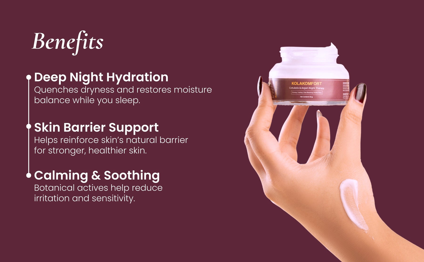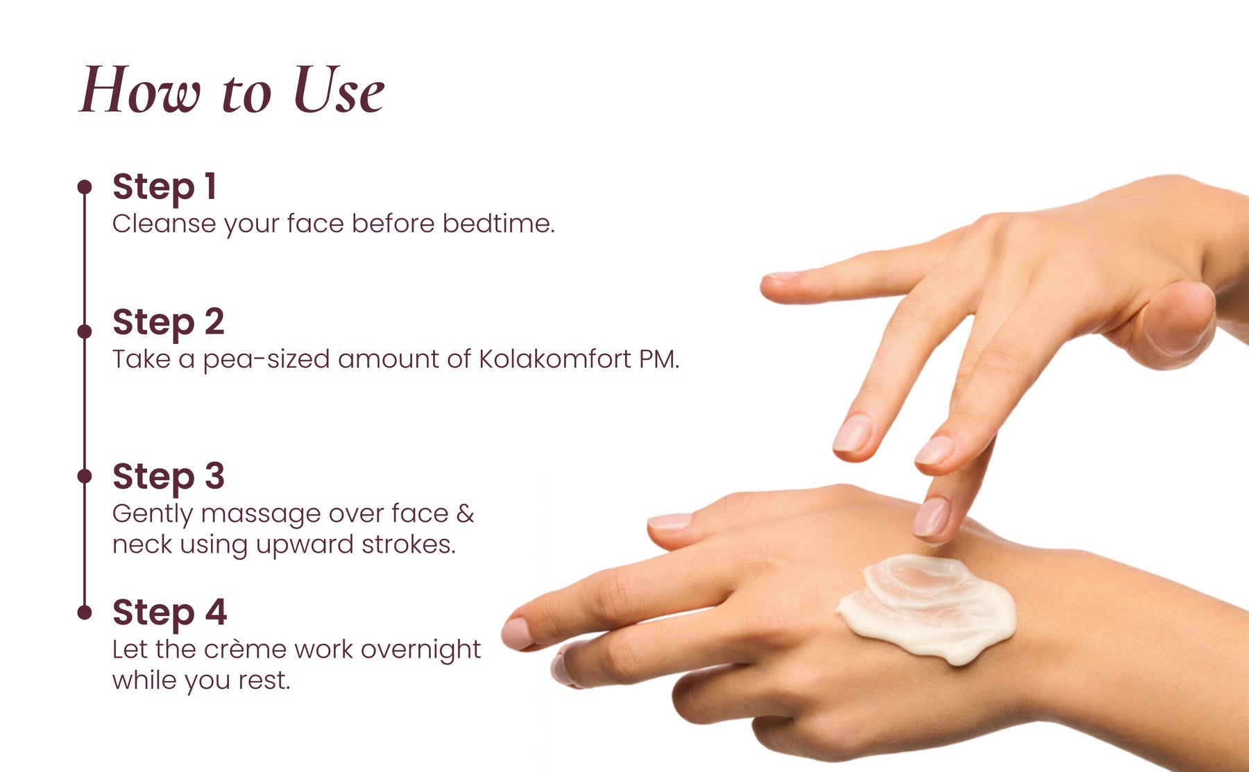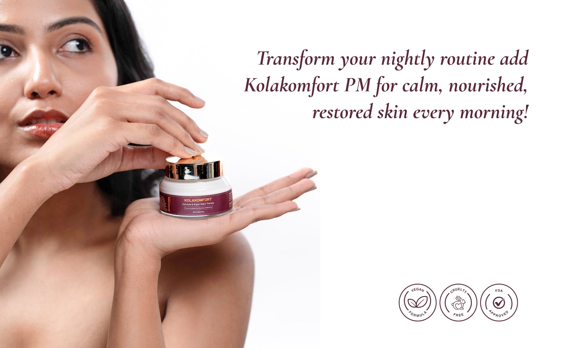 KolaKomfort PM is an overnight repair cream that deeply hydrates, smooths fine lines, and restores skin vitality while you sleep. It helps you wake up to plumper, calmer, and more radiant skin by supporting the skin’s natural nighttime renewal cycle.
