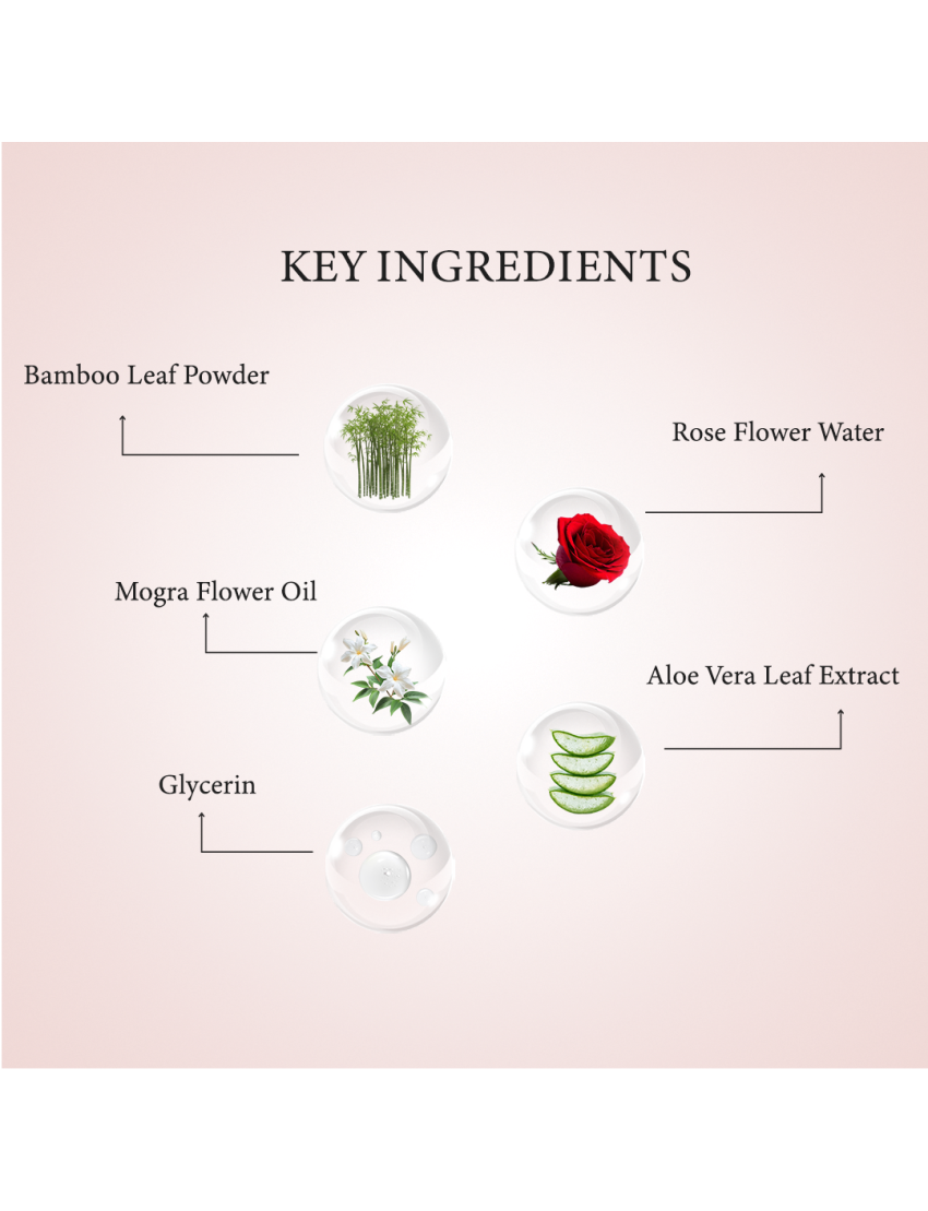 - Rose Water & Mogra Essential Oil: Clarifies and rejuvenates