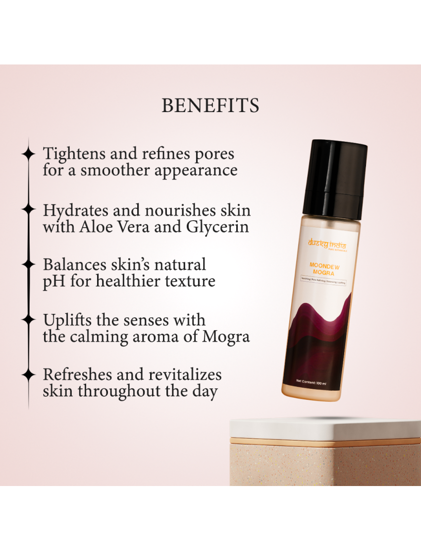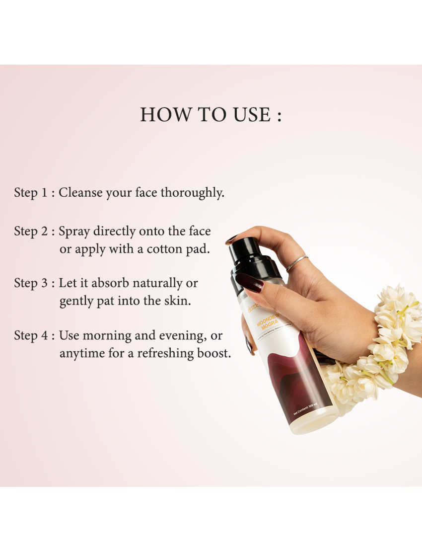 Use Moondew Mogra Toner morning and night after cleansing to refresh, balance, and prep your skin. It’s perfect whenever your skin feels oily, congested, or in need of a soothing, pore-refining boost.