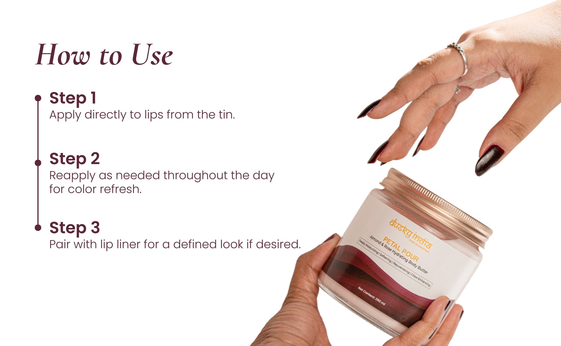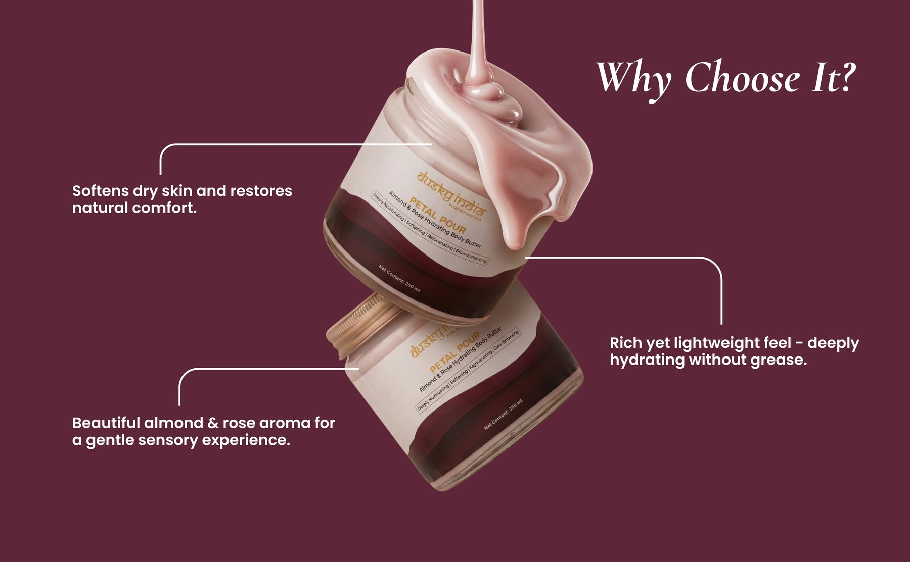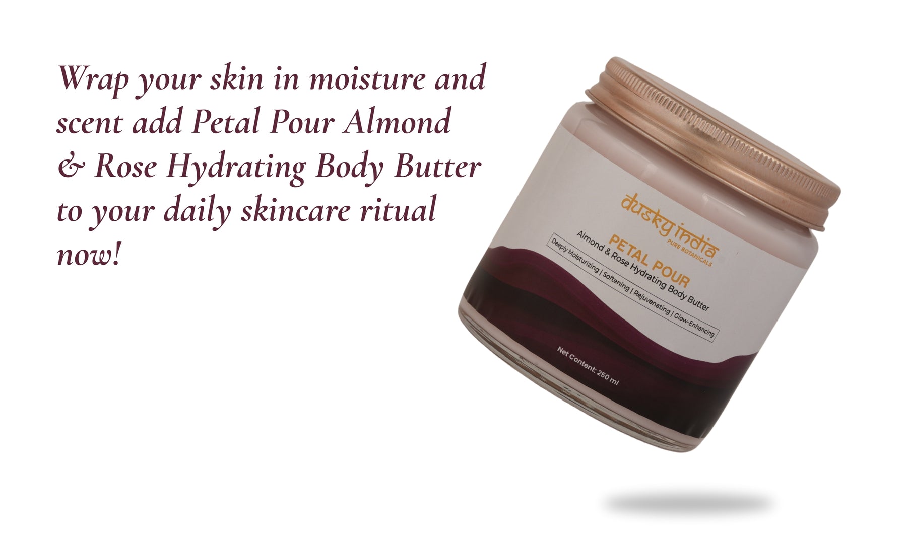 Use Petal Pour – Almond & Rose Hydrating Body Butter daily after a shower on damp skin to lock in moisture and softness. It’s ideal whenever your skin feels dry, tired, or needs a boost of glow and rejuvenation.